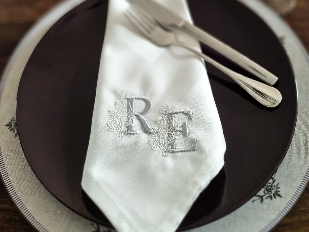 Du wählst die Garnfarben für ein oder zwei Buchstaben sowie die Platzierung des Monogramms – so wird jede Serviette zum Ausdruck deines Stils oder zu einem besonderen Geschenk für Familie und Freunde.